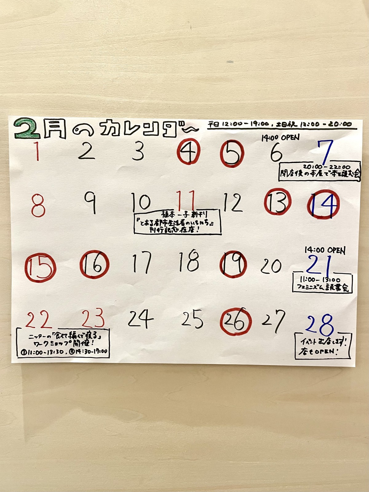 1/24(土)営業日。だいぶ苦戦したがMacにリソのソフトが無事にインストールでき、とうとうリソが動いた。歓喜!切らしていた店のチラシをさっそく刷る。チラシに掲載している営業情報はこれまでに何度も変えている。オープン当初は木曜だけの休みで毎日11:00-20:00で開けていたが、夏はサマータイム営業で14:00-21:00にしていた。そのあと9月に入り営業時間を元に戻すタイミングで、自分たちの体力とよくよく相談した結果、隔週で水曜日も休むことにした。そして11月からは平日12:00-19:00、土日12:00-20:00とさらに営業時間を短くした。以前の時間に戻してできるだけ長く開けておきたいとは思うけれど、すべてを取ることはむずかしく、これからも試行錯誤しながらやっていくのだと思う。夜の読書室は常連さんが数名利用してくださり、ありがたかった。22時まで営業してもあまり疲れておらず、日々のストレッチの効果が出ているのかもしれない。