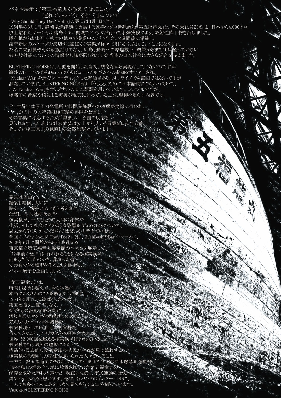 2月28日(土)、小岩にあるKoiwa BUSHBASHで開催されるライブ、”BLISTERING NOISE Presents 「WHY SHOULD THEY DIE?」Vol.5 に出張ブックショップとして出店します!ライブの翌日3月1日が第五福竜丸の水爆実験による被爆の日にあたるということで、パネル展示「第五福竜丸が教えてくれること/連れていってくれるところ」も企画されているとのこと。チケットは当日販売、ぜひ足をお運びください〜!