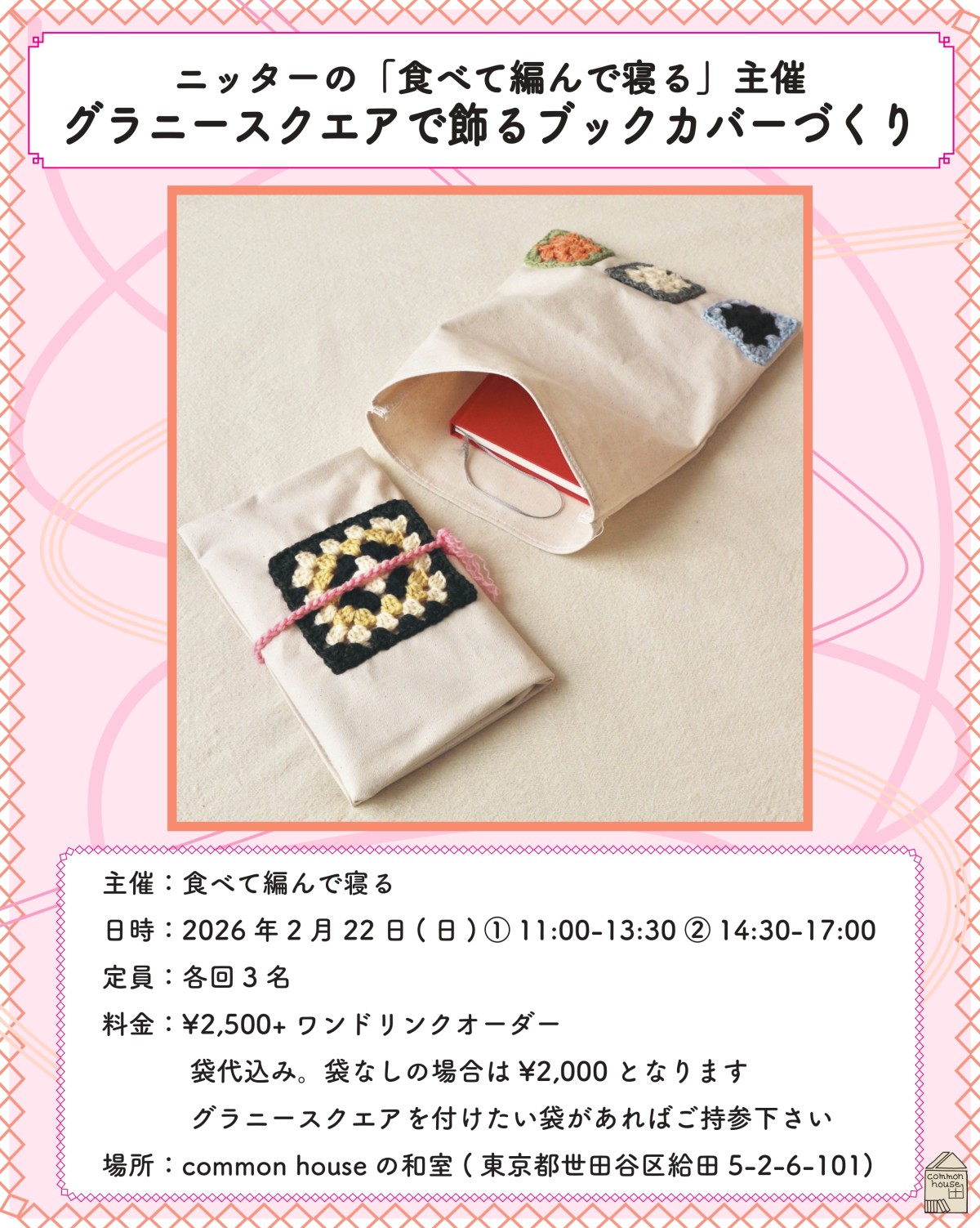 「編み物が初めての方も、やったことがあるけど不安な方も、ベテランさんも、リピーターさんも、みんなでcommon houseの和室でゆったりあみあみしませんか前回のワークショップでは、時に手元に集中しつつ、ぽつぽつといろんなおしゃべりが生まれたりして、とても楽しく過ごさせてもらいました。今回もとても楽しみにしています。」